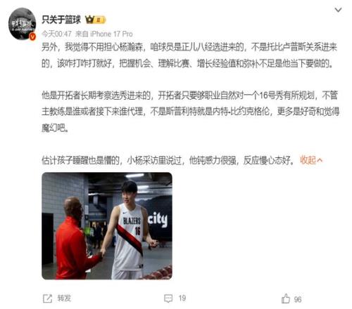 也有一些大V明白,一个新秀不要寻思主教练给不给机会,杨瀚森也不是托关系进的NBA,他需要的还是继续提升自己的即战力,开拓者的球探部门对杨瀚森的观察是长期的,对小杨的培养计划也是长期的,不会因为某个人出了问题就放弃这个计划。